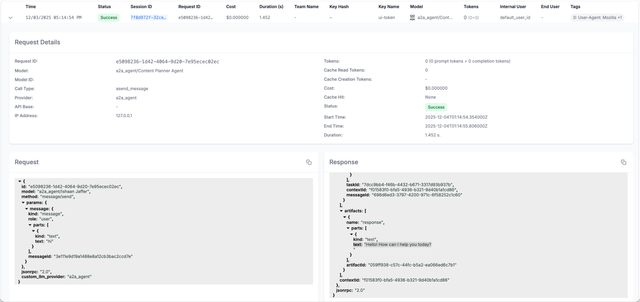 After invoking an agent, you can view the request logs in the LiteLLM Logs tab.