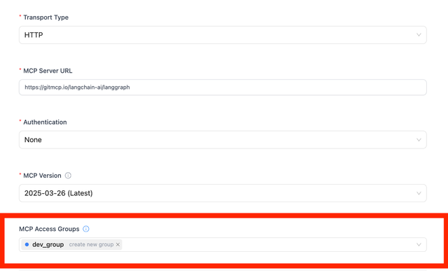 - Under "MCP Access Groups", create a new group (e.g., "dev_group") by typing it