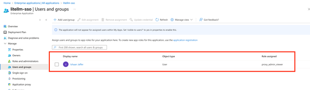 Note: The role from Entra ID will take precedence over any existing role in the LiteLLM database. This ensures your SSO provider is the authoritative source for user roles.